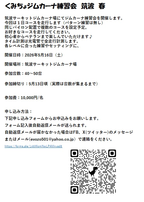 ジムカーナ練習会のお問い合わせはメール(t-umezawa@io-info.link)か、facebookのメッセージにてお願いします。