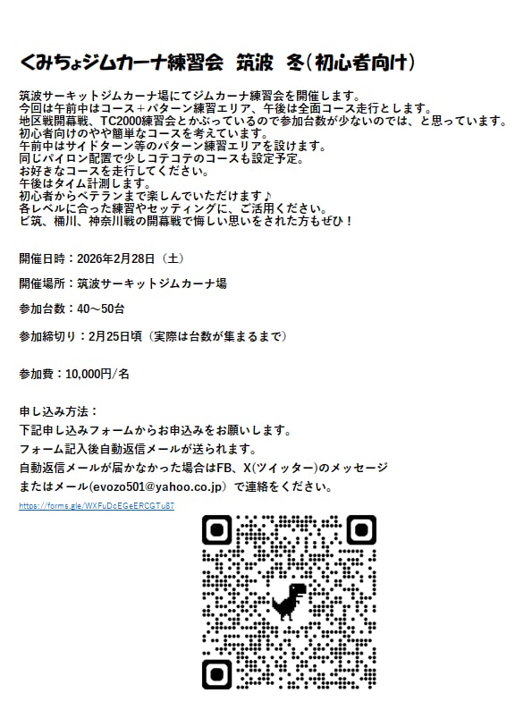 ジムカーナ練習会のお問い合わせはメール(t-umezawa@www.io-info.link)か、facebookのメッセージにてお願いします。